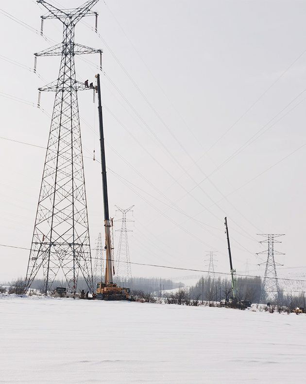 凛冬时节,银装素裹的旷野上,数座输电铁塔巍峨矗立,一台大型起重机正配合施工人员对铁塔开展作业,电力建设者们在严寒中奏响了电网升级的奋进乐章。